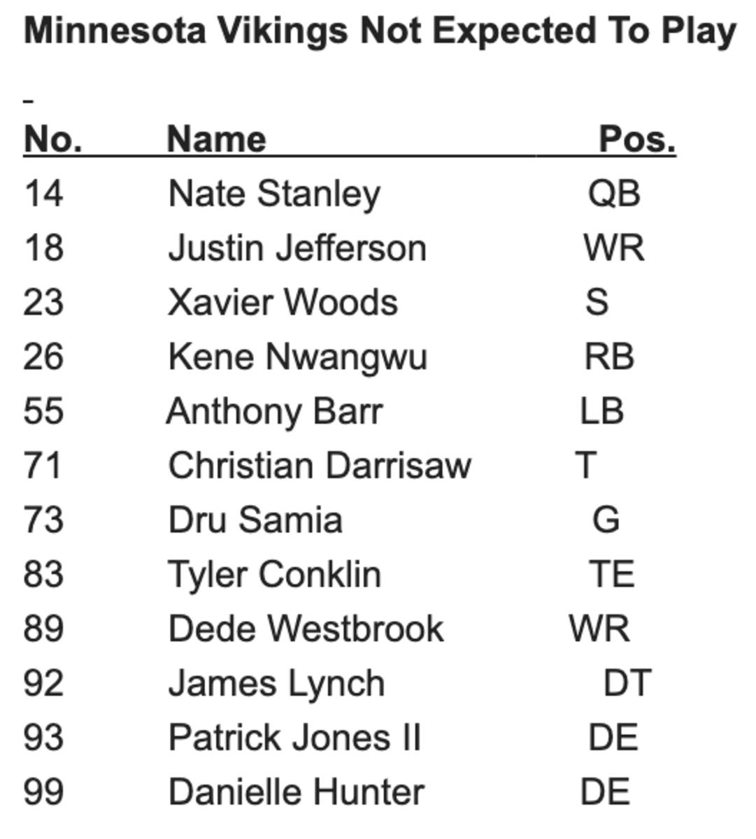 Hither's the list of 12 Vikings who volition not play due to injury. The team is just being cautious with players similar Justin Jefferson and Danielle Hunter, who are expected to exist good to go for the regular flavour.